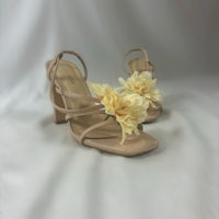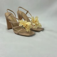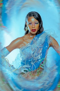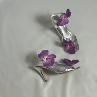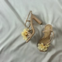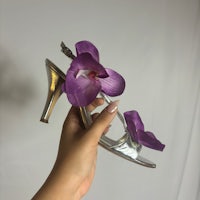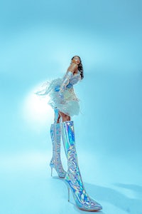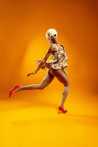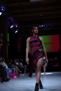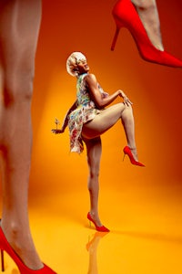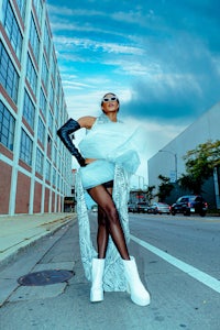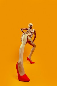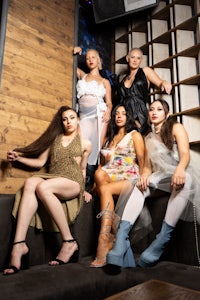 a woman sitting on a stool wearing a black top and a plaid skirt